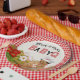 Red gingham with wood and red & white floral accent with baby BBQ chef.