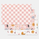 Celebrate the arrival of a sweet baby girl with this charming set of 3 baby shower wrapping paper sheets. Each sheet features a unique and heartwarming design: soft pink gingham plaid, playful baby-themed illustrations with strollers and hearts, and adorable animals like giraffes and elephants in blush and peach tones. Perfect for wrapping baby shower gifts, newborn presents, or first birthday surprises. These feminine, whimsical prints add a special touch to your thoughtful gift.