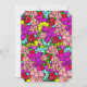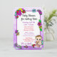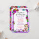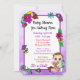 Purple themed girl's baby shower invitations. Pretty little hand drawn whimsical floral baby girl holding a teddy bear surrounded by brightly coloured pretty flowers. The back is a colourful mesh of whimsical folk art style flowers in red, purple, pink, blue, teal and yellow.