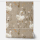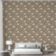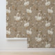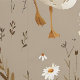 Cute taupe nursery wallpaper featuring a pattern of a white baby goose and terracotta and white daisy florals.