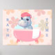 It's bath time and here's an adorable baby hippo sitting in a pink bath tub and wearing a pink turban, taking a bubble bath to keep you company! There's a pretty wallpaper of flowers in the background.
