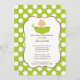 Adorable Boy Baby Shower invitation featuring a cute baby in a sweet pea pod set on a green & white polka dots background. Matching items available in our shop. Perfect for a baby boy, baby girl or neutral baby shower. ©JD Digi Designs