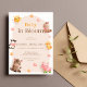 This adorable baby shower Baby in Bloom invitation features a charming farm animal theme with cute illustrations of a cow, bunny, chick, horse, and pig, surrounded by cheerful flowers and a smiling sun. The soft pastel colours and whimsical design create a warm and inviting atmosphere. Visit our shop to view our entire Brown Cute Farm Animal collection