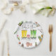 "Baby in Bloom" Mum dad and pink baby rubber boots rain boots illustration at centre with gardening tools all around