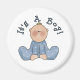 Baby boy announcement buttons, T-shirts, mugs, cards, and more with an adorable baby boy in a blue sleeper and text that reads "It's a Boy!".