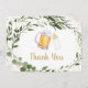 This thank you card features watercolor greenery with a beer and baby bottle and gold foil accents.
