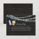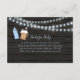 Enclose a Books For Baby card for the Baby Is Brewing baby shower. Rustic, blue string lights with blue baby bottle and frothy mug of beer on dark wood background.