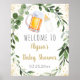 Every Mum to be deserves a special day to celebrate! Welcome your baby shower guests with an adorable personalised sign. Frame the sign and display it on a table near the entrance or mount the poster on foam and display it outside on an easel. The design features watercolor greenery with a beer and baby bottle and gold foil accents.