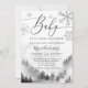 Modern baby shower invitation card featuring watercolor art of the winter mountain with pine trees with snowflakes in grey. The text says "Baby it's cold outside." Gender neutral design.