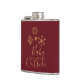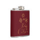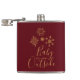 A flask with an illustration of fancy golden snowflakes with elegant crystalline shapes. Trendy typography says: Baby it's cold Outside. Red burgundy background.