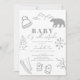 This chic "baby it's cold outside" gender-neutral baby shower invitation features a white background with hand-drawn winter illustrations, such as mountains, skis, gloves, a beanie, polar bear, tree, and snowflake in light grey. The reverse side features a pale grey background with white snow pattern. Personalise it for your needs. You can find matching products at my store.
