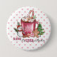 Whimsical pin to wear on the lapel of your winter coat, has a background of white with red hearts, a hot cocoa mug filled with cocoa, marshmallows and a candy cane, a little snowman beside it. There are also 2 red and white swirl candies, cinnamon sticks, a gingerbread man cookie and a little Christmas tree. At the bottom it read "Baby it's cold outside".