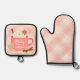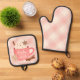 Baby it's cold outside winter holiday oven mitt and pot holder set. This design features a warm mug of hot chocolate with whip cream on top surrounded by cinnamon and sweet gingerbread cookies on a pink plaid background.