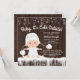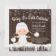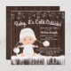 Baby it's cold outside baby shower invitation with adorable baby wearing a white snow outfit and hat on a rustic wood and snow snowflake background. These cute winter snowflake baby shower invitations are easily customised for your event by simply adding your details.