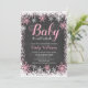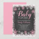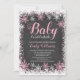 Trendy girl winter themed baby shower invitations. This stylish design features a pink and white snowflake border and script font on a chalkboard background.