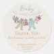 These gender neutral winter Baby Shower Thank You stickers feature a cute hand-drawn illustrations of pajama bodysuits, plush animals and baby bibs hanging on a clothesline. Customisable name, event, date and a personal thank you message. Elegant ivory background.