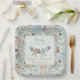 These gender neutral winter or holiday season Baby Shower paper plates feature cute hand-drawn illustrations of Christmas pajama bodysuits and plush animals on a clothesline and customisable name and event. Elegant soft green background.
