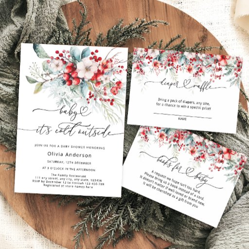 The Baby it's Cold Outside Winter Don't Say Baby Game Poster features a whimsical winter design, perfect for celebrating a little one during the frosty season. At its heart, the item is adorned with frosty blooms and vibrant winter berries, creating a festive yet elegant ambiance. Soft, icy red tones blend beautifully with blush pinks and muted greens, giving it a cosy, inviting feel. The berries and flowers are rendered in a watercolor style, adding a touch of warmth amidst the winter chill. This item is ideal for a baby shower that embraces the magic of winter, offering a perfect balance between sophistication and warmth. Matching items are available.