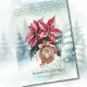 Our watercolor Christmas design features a vintage image of the Baby Jesus inlaid in a gold frame accented with red poinsettias on a wintery background of snow covered evergreens.