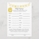 A fun game for the baby shower is the Baby language game. This game features a yellow banner at top and a barrel of honey. On the reverse is a girl teddy bear leaning on a honey barrel watching a honey bee with templates.