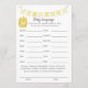 A fun game for the gender reveal party is the Baby language game. This game features a yellow banner at top and a barrel of honey. On the reverse is a teddy bear leaning on a honey barrel watching a honey bee with templates.