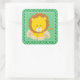 This sticker features a green border of a repeating pattern of jungle leaves. A cute baby clipart orange and brown lion sits in the centre of the sticker over a solid green background.