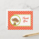 Baby shower thank you postcard. With a cute baby monkey with a pacifier in his mouth Inside an olive green circle. The background is an orange and white polka dot pattern. Custom message on the back which can be changed or left as is.