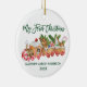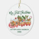 Modern Brush Script My First Christmas Baby Ornament includes Watercolor Gingerbread Train with candy, cookies and pines. Green.