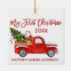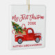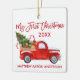 Modern Brush Script My First Christmas Baby First Christmas Ornament includes Watercolor Vintage Red Truck with Christmas Trees, Snow, Christmas Presents and Candy Canes. Red Script.