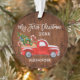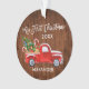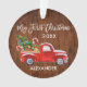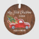 Modern Brush Script My First Christmas Baby First Christmas Ornament includes Watercolor Vintage Red Truck with Christmas Tree, Snow, Christmas Presents and Candy Canes. Rustic Country Wood Print.