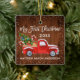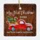 Modern Brush Script My First Christmas Baby First Christmas Ornament includes Watercolor Vintage Red Truck with Christmas Tree, Snow, Christmas Presents and Candy Canes. Rustic Country Wood Print. Snow Border.