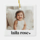 This holiday ornament is perfect for parents, godparents, grandparents and loved ones featuring a photo of the baby. This design blends modern simplicity with seasonal charm. It features a photo and the little one's name in a bold typographical design is accompanied by a delicate heart next to it.