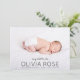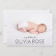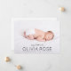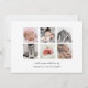 Baby Name Photo Collage Modern Baby Birth Announcement is great for both girls and boys. The front is one giant hero image with a black text overlay that you can fully edit including the intro line, baby's name in big sans serif letters, followed by birth stats. The back has a six photo collage you can fully edit