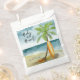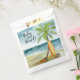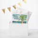 Baby on Board! Baby shower invitation - perfect for a summer baby shower. Beach theme. Watercolor design has a ocean and beach scene with surfboard, palm tree and summer hat.