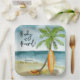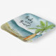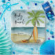 Baby on Board! Baby shower invitation - perfect for a summer baby shower. Beach theme. Watercolor design has a ocean and beach scene with surfboard, palm tree and summer hat.