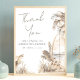 Express gratitude to your guests with this charming boho beach-themed sign, perfect for thanking everyone for celebrating your special day. The design features a heartfelt thank you message in soft tan and brown tones, using a mix of handwritten script calligraphy and classic serif fonts for a balance of elegance and modern style. On the left side, a beautifully illustrated surfboard is paired with a tropical palm tree, delicate orchid flowers, and lush greenery, capturing a serene coastal vibe.