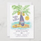 Beach and surfing theme baby shower invitation features a "baby on board" caption, a watercolor tropical island with surfboard, palm tree, a kawaii sunshine and starfish. The predominant colour is a muted purple so it is perfect for boy and girl babies. Shown here as a couples shower invitation but you can personalise the name to be for a couple or just use the mum-to-be's first and last name. Art by KL Stock