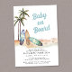 Cute surfing-themed baby shower invitation adorned with watercolor beach scenes, palm trees, sandy shores, and surfboards, and "Baby on Board" in a fun retro blue script. Add the mother-to-be's name and shower details in simple modern lettering.