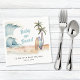 Cute summer surfing-themed baby shower napkins featuring a watercolor tropical beach scene with breaking waves, palm trees, sandy shores, and teal and brown surfboards, and "Baby On Board" showcased in a fun retro blue script. Personalise the mother's name and baby shower date in simple lettering.