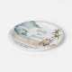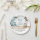 Cute surfing-themed paper plates for your baby shower featuring a watercolor tropical beach scene with breaking waves, palm trees, sandy shores, and surfboards, and "Baby On Board" showcased in a fun retro blue script. Personalise the mother's name and baby shower date in simple lettering.