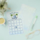 Baby on board surfing splash blue boy baby shower bingo game card. Introducing our adorable baby shower bingo game card with a unique twist! This captivating design showcases three vibrant surfing boards against a backdrop of soft blue hues, complemented by palm trees and sunrays. The light blue background adds a touch of serenity, enhanced by a playful aqua blue water splash effect. On the reverse side, you'll find the same water splash motif, creating a cohesive and delightful aesthetic. Get ready to make a splash at your baby shower with this captivating and fun-filled bingo game card!
