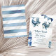 Celebrate the upcoming arrival with our charming "Baby on Board" Navy Nautical Baby Shower Invitation. This delightful invitation features whimsical watercolor illustrations of two whales wearing striped top hats, a lighthouse, and a delicate flower, all in classic navy blue and white. The back of the card is beautifully adorned with horizontal navy stripes painted in watercolor technique on a white background. The text is customisable and written in a playful yet elegant blue font pair, perfect for setting the tone for a joyous and memorable baby shower.