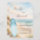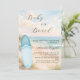 An elegant invitation for a Baby Shower, celebrating a baby boy. A watercolored sandy beach, ocean waves as background, and a blue surfboard on the beach.