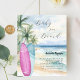 An elegant invitation for a Baby Shower, A watercolored sandy beach, ocean waves and palm trees as background, and a blue and a pink surfboard on the beach. For a gender reveal or expecting twins.