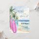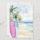 An elegant invitation for a Baby Shower, A watercolored sandy beach, ocean waves and palm trees as background, and a blue and a pink surfboard on the beach. For a gender reveal or expecting twins.