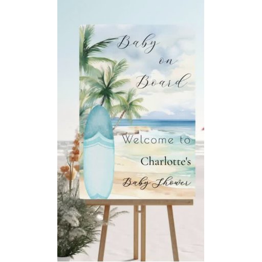 A welcome sign for a Baby Shower, celebrating a baby boy. A watercolored sandy beach, ocean waves and palm trees as background, and a blue surfboard on the beach.