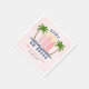Baby on board surfing splash pink baby girl shower paper napkin. Surf's up for a little dude! This adorable baby shower design, featuring three pink surfboards, swaying palm trees, and sunshine bursting through a light pink sky, is the perfect way to welcome a new little surfer into the world. The water splash effect adds a touch of whimsy to this beachy celebration.