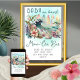 The "Baby on Board" tropical surfing-themed exotic floral design is a baby shower template that features a gender-neutral theme with a tropical flair. The design depicts a grouping of colourful surfboards with the ocean and a splashing wave amidst a beautiful tropical floral surround. The colour scheme consists of soft shades of green, blue, pink, and yellow, creating a soothing and inviting atmosphere. The typography is playful and fun, making it perfect for a baby shower celebration.