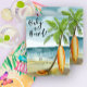 Baby on Board! Baby shower invitation - perfect for a summer baby shower. Beach theme. Watercolor design has a ocean and beach scene with surfboard, palm tree and summer hat.
