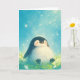 A fluffy baby penguin sits peacefully in a lush green meadow, bathed in the soft glow of warm sunlight. The penguin's eyes are closed, and a gentle smile graces its face, exuding pure joy and serenity. Delicate snowflakes float through the air, adding a touch of magic to the scene. The backdrop features a dreamy blue sky filled with soft bokeh light, creating an ethereal and heartwarming atmosphere. This charming illustration captures a whimsical blend of winter and spring, making it perfect for nature and animal lovers.